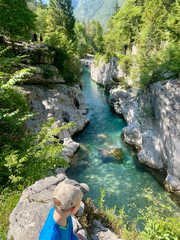 We hiked along the Great Gorge, arriving at a beautiful swim hole where we dipped our toes in the freezing water. The source of the Soca River is an underground spring and is a constant cold temperature of around 10 degrees Celsius. We arrived at this beautiful spot with only one or two other fellow hikers also drinking in the view. The kids enjoyed watching the freshwater bass swim upstream from the cliff tops into the crystalline waters below. As the morning wore on, the area became much more populated.