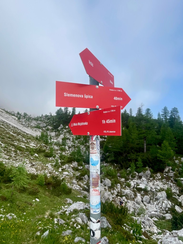 To hike Slemenova Špica: Park at the top of Vršič Pass, cross the street, and follow the trail marker for Slemenova Špica. The trail is well marked and easy to follow. The trail will immediately begin a slow ascent up scree to a small saddle. After this initial uphill, the rest of the hike is much flatter (best to get the hardest part out of the way with kids early anyway). At the top of the saddle, the trail will split; follow the signs towards Slemenova Špica to the right. Especially with small children, I do not recommend going left on the more exposed path towards Mala Majstrovka.