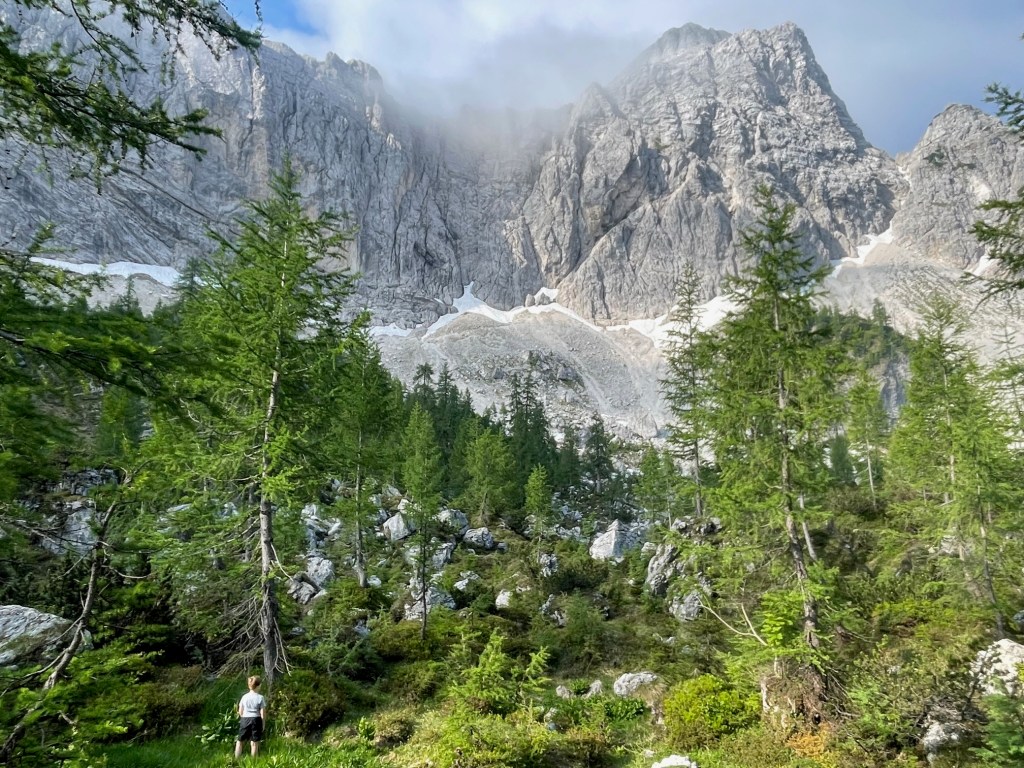 Along the hike, you are treated to stunning views of the mountains and can see (and hear) mountain climbers on the rockface of Mala Majstrovka. There is also a nice valley with boulders for kids to climb and play on for a break from hiking. In June there were still some spots of snow, which is a typical hit for children along the way. As you continue, you will pass blankets of wildflowers adorning the ground and mountain views that open towards both Italy and Austria.