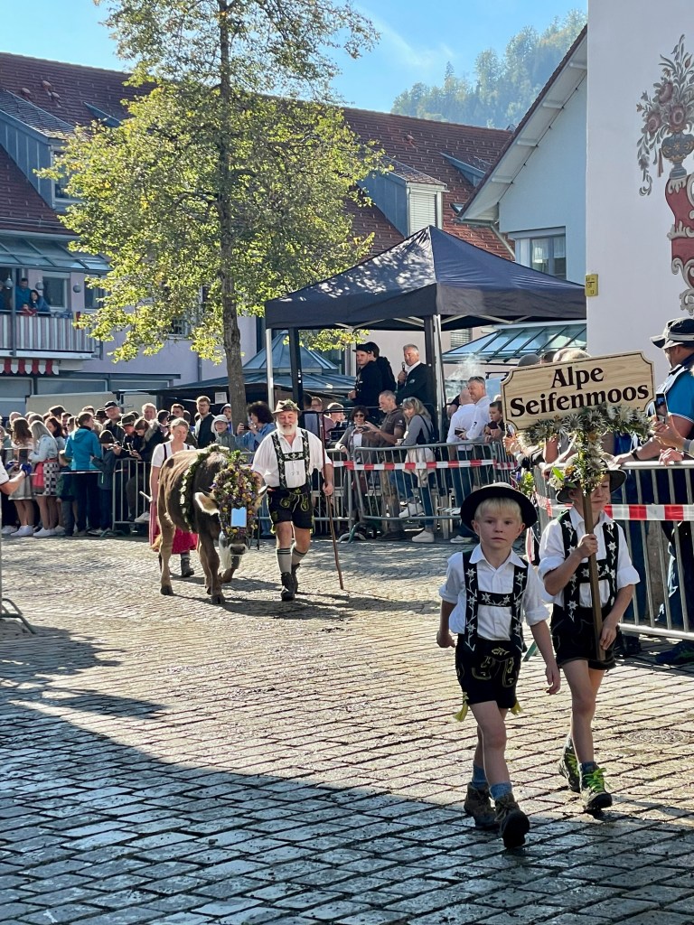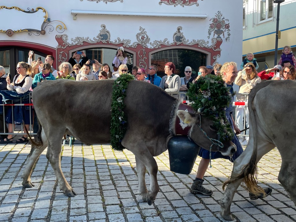Other cow parades that we attended in Germany had a more formal and structured format, resembling a more classic parade style with a designated area for spectators to stand, an announcer providing commentary, and signs representing each family in the procession.