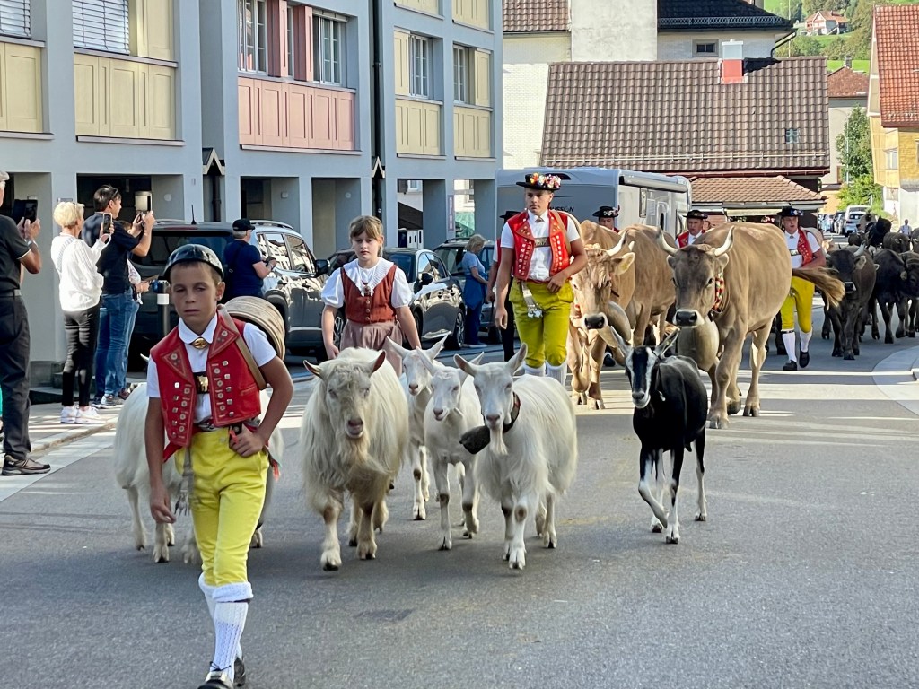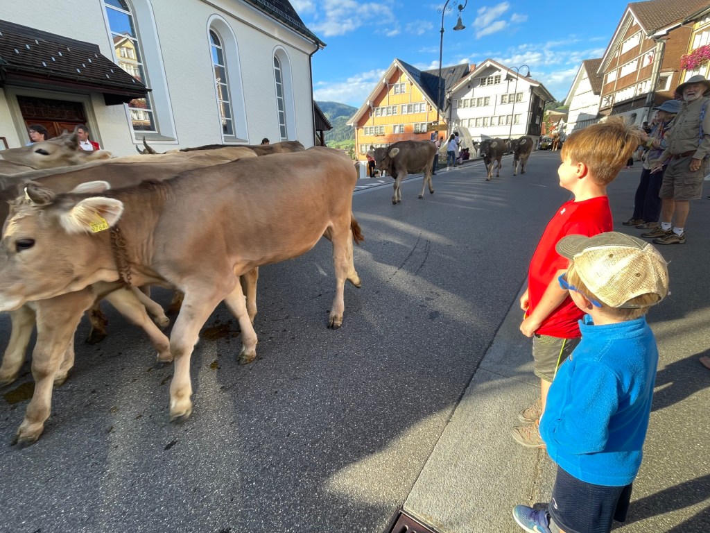 Each town hosting a cow parade has its own distinct feel. The one we attended in Urnasch, in the Apenzell region of Switzerland, for example, felt particularly traditional, with cows wandering freely down the street, sometimes venturing remarkably close to our kids, who were both thrilled and a bit startled by their size and proximity. Farmers along the route were offered hearty drinks en route from local bars, adding a festive atmosphere.