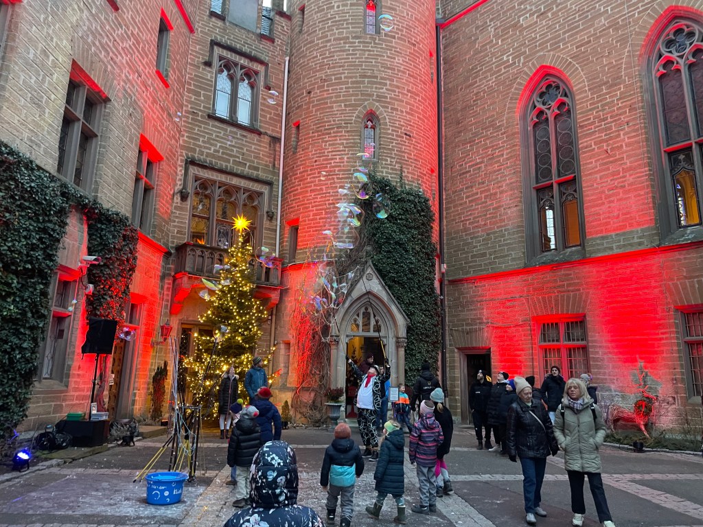 A clown in the courtyard provides entertainment for the littles, making oversized bubbles. Our kids were more than happy to chase giant bubbles while we watched nearby with our glühwein, soaking in the festive atmosphere of the castle.