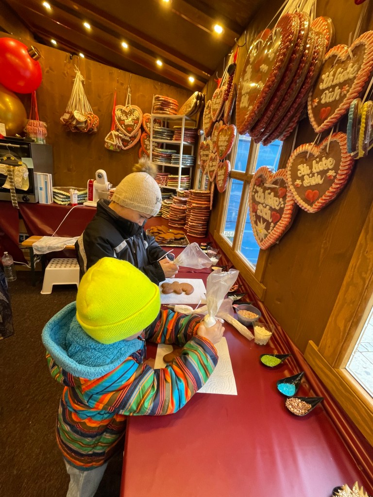 If you’re a savvy parent, head straight to the gingerbread vendor where, for a small fee, kids can decorate their very own gingerbread! When the gingerbread creation is complete, the vendor quickly re-heats to fortify the decorations and wraps them for your kids to wear around the market! This activity was hands down my kids’ favorite activity out of all the Christmas markets they’ve visited.